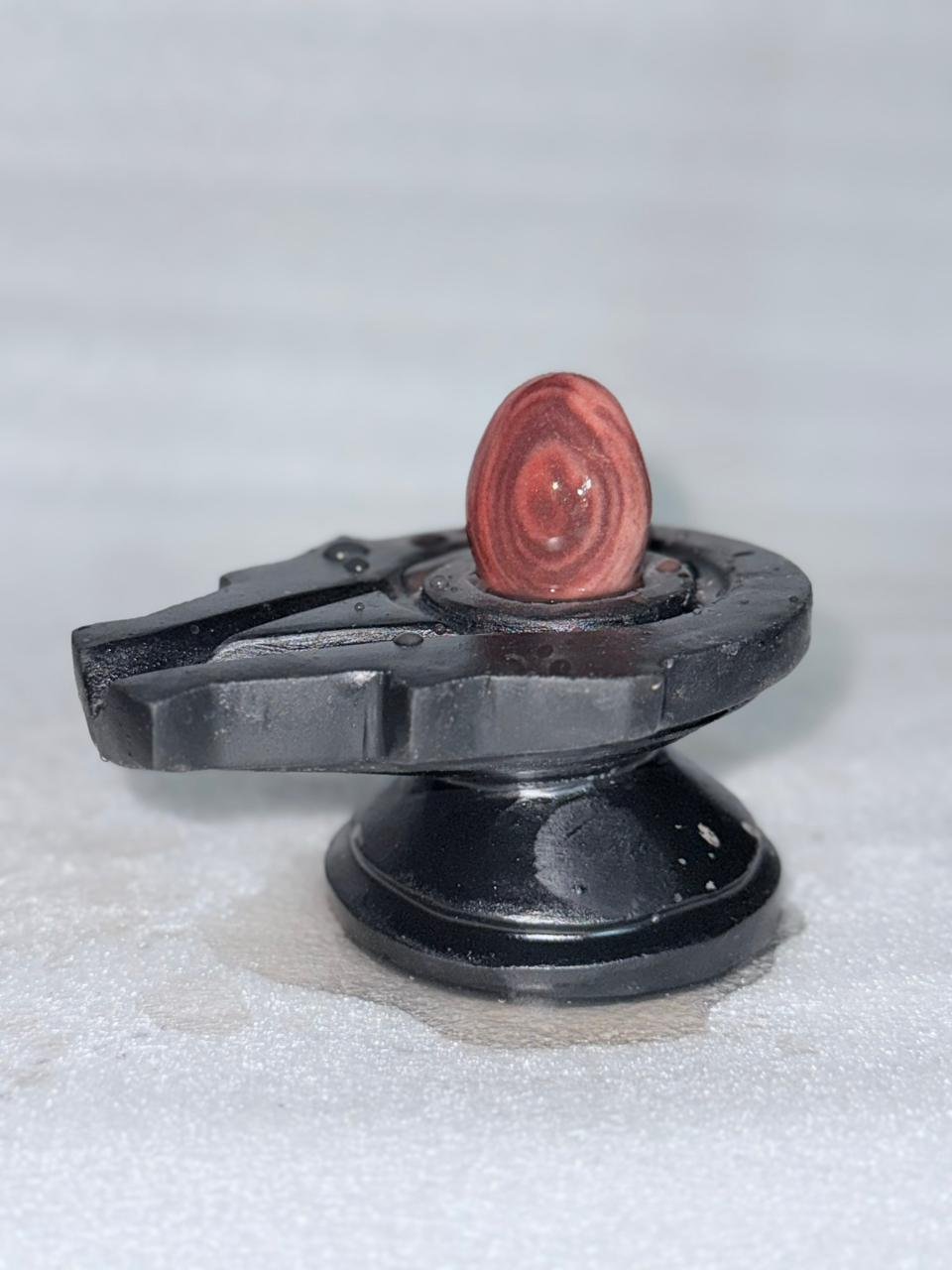 This beautifully crafted Shivling features a natural red swirl stone with concentric patterns symbolizing cosmic energy. Mounted on a solid black Yoni base, it is ideal for daily puja, meditation, and sacred décor.