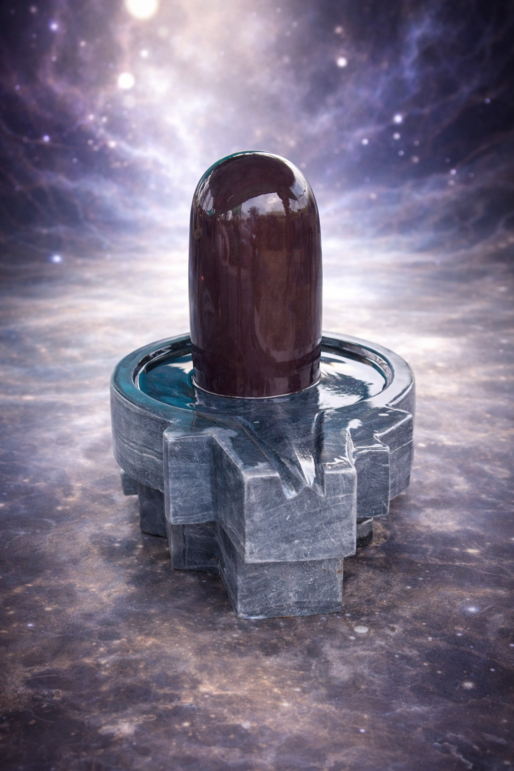 This grand Narmadeshwar Shivling is crafted from sacred Narmada river stone and features a smooth, deep-brown polished finish. Mounted on a solid temple-grade yoni base, it is ideal for large temples and sacred installations.