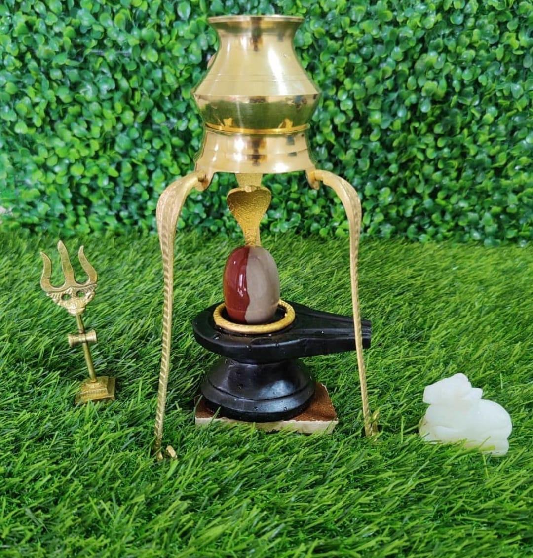 This divine Shivling set features a naturally toned Shivling placed on a black Yoni base, complemented with an elegant brass Jaladhara for continuous abhishek. A complete sacred setup symbolizing purity, devotion, and spiritual flow.