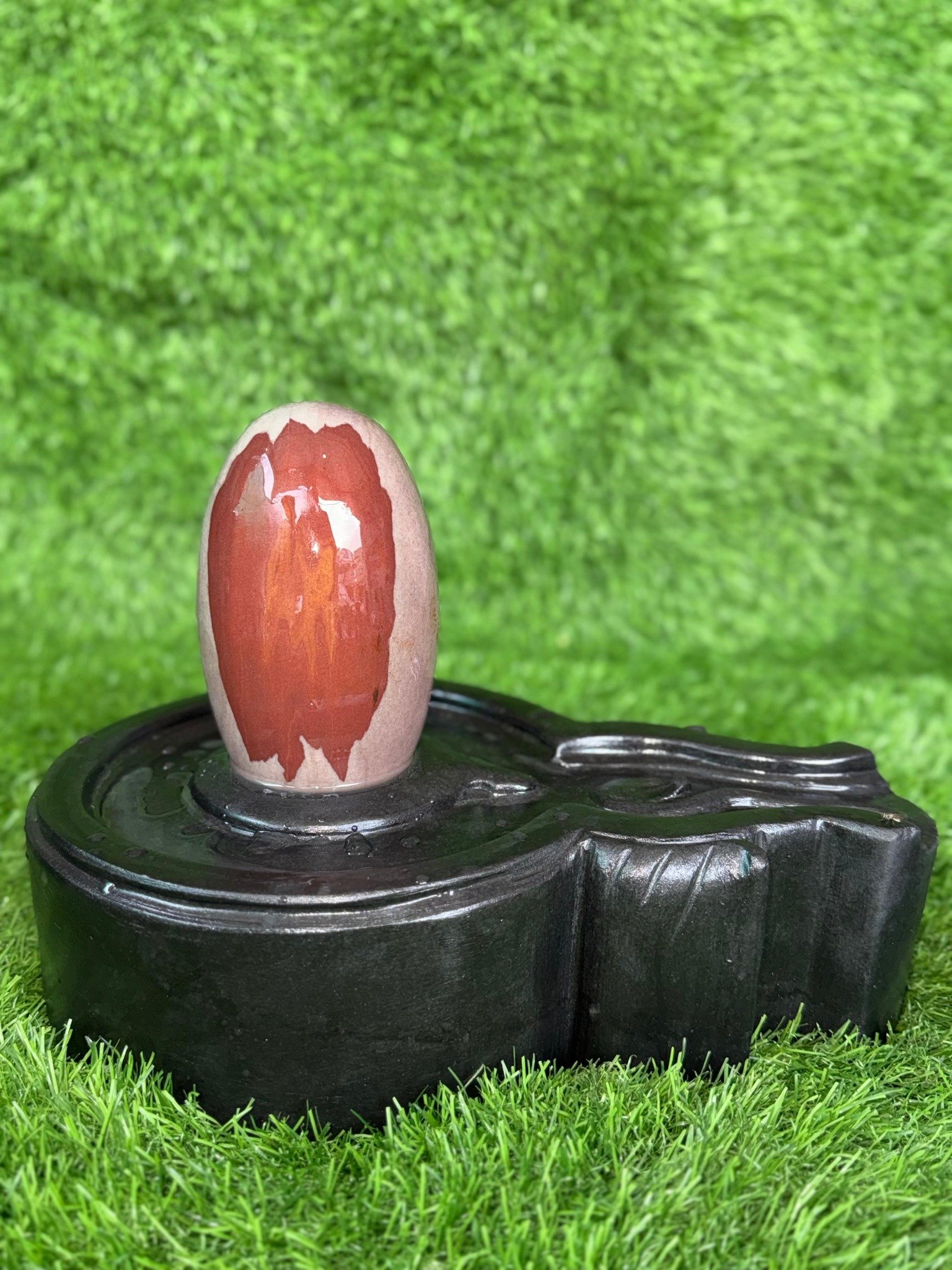 A unique natural stone Shiva Lingam featuring striking red patterns, set on a handcrafted black stone Yoni base. Symbolizes divine energy, creation, and spiritual harmony for sacred spaces.